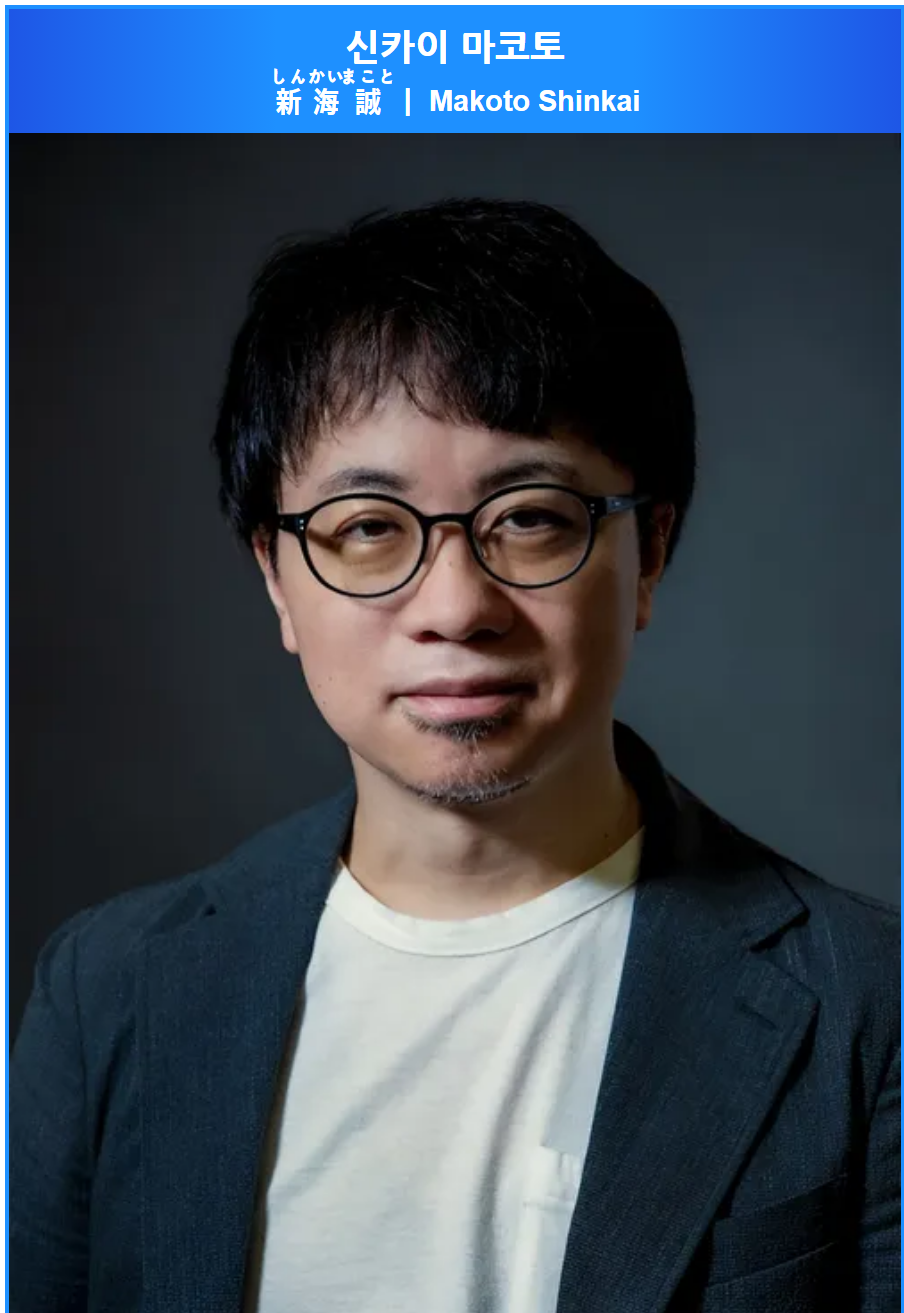 안녕하세요 국내 애니영화 돌풍 몰고 다니는 신카이 마코토입니다. 여러 가지 유명한 작품 올리면 딱 성공 작품은 현재 스즈메의 문단속으로 400만 명 돌파 중 1000만 관객 나올지 않을까 합니다. 신카이 작품 소개할까 합니다. 다시 보기 감상하면 다음 작품 은 뭐 나올까요. 스즈메의 문단속, 너의 이름은, 날씨의 아이 간략한 소개 합니다. 신카이 마코토 어떤 인물부터 합니다. 4월 말에 한국팬과 미팅 약속으로 한국에서 팬미팅합니다.